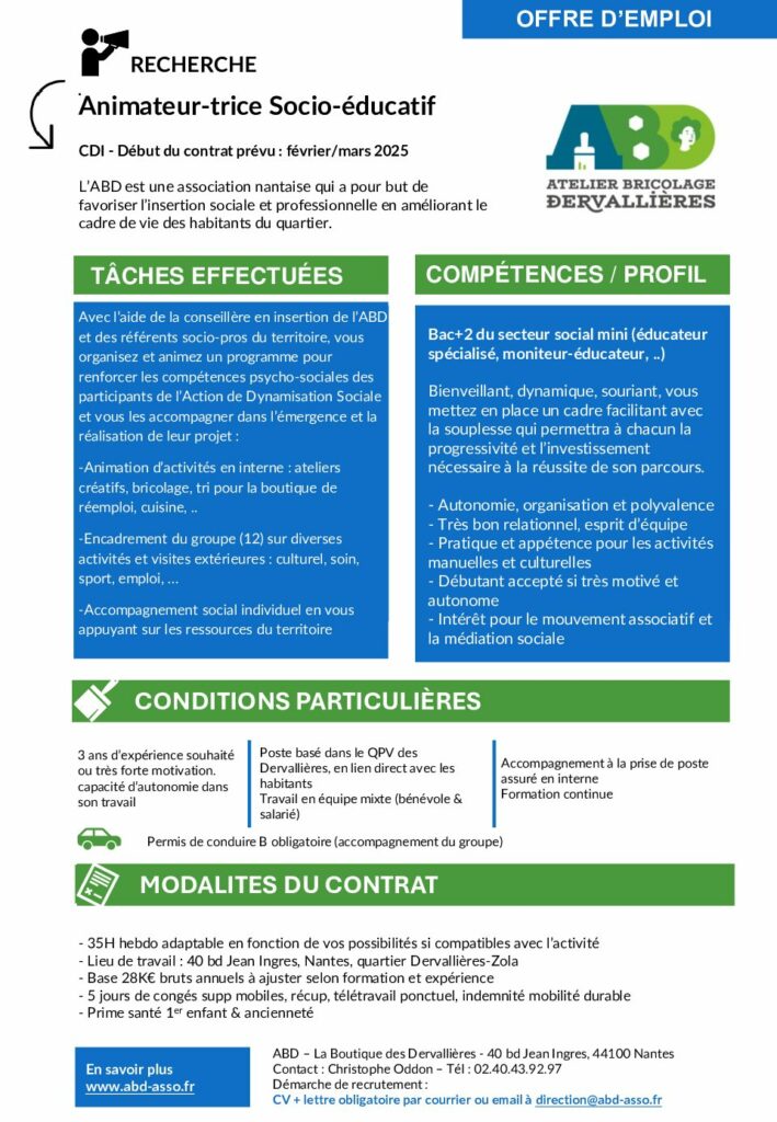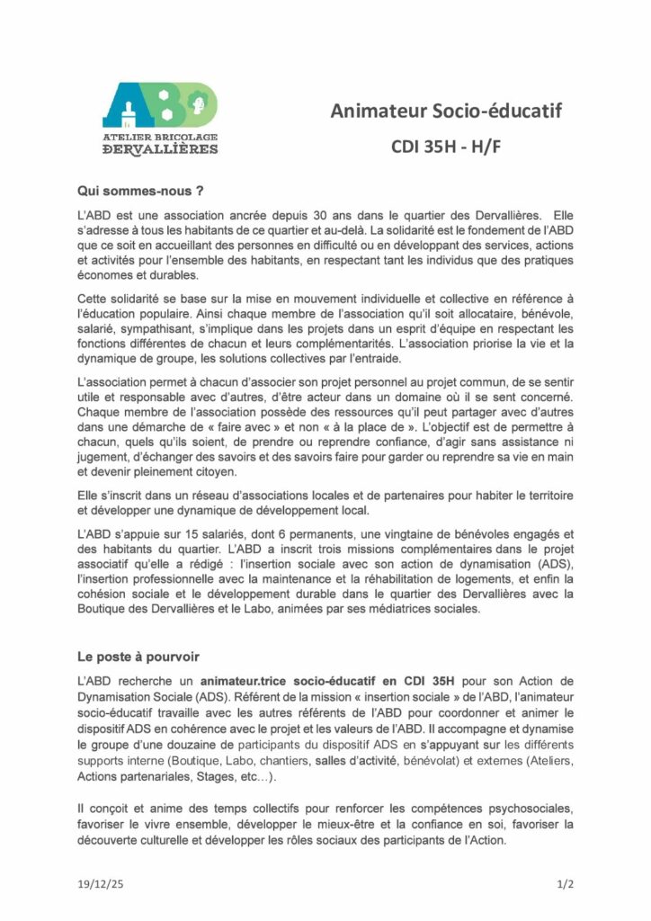 Le poste repose sur l’animation de temps collectifs visant à renforcer les compétences psychosociales, le vivre-ensemble, la confiance en soi et le mieux-être, tout en favorisant l’ouverture culturelle et la prise de rôles sociaux. L’animateur·trice s’appuie sur les ressources internes de l’ABD (Boutique des Dervallières, Labo, chantiers, salles d’activités, bénévolat) ainsi que sur un réseau de partenaires extérieurs pour construire des parcours adaptés.